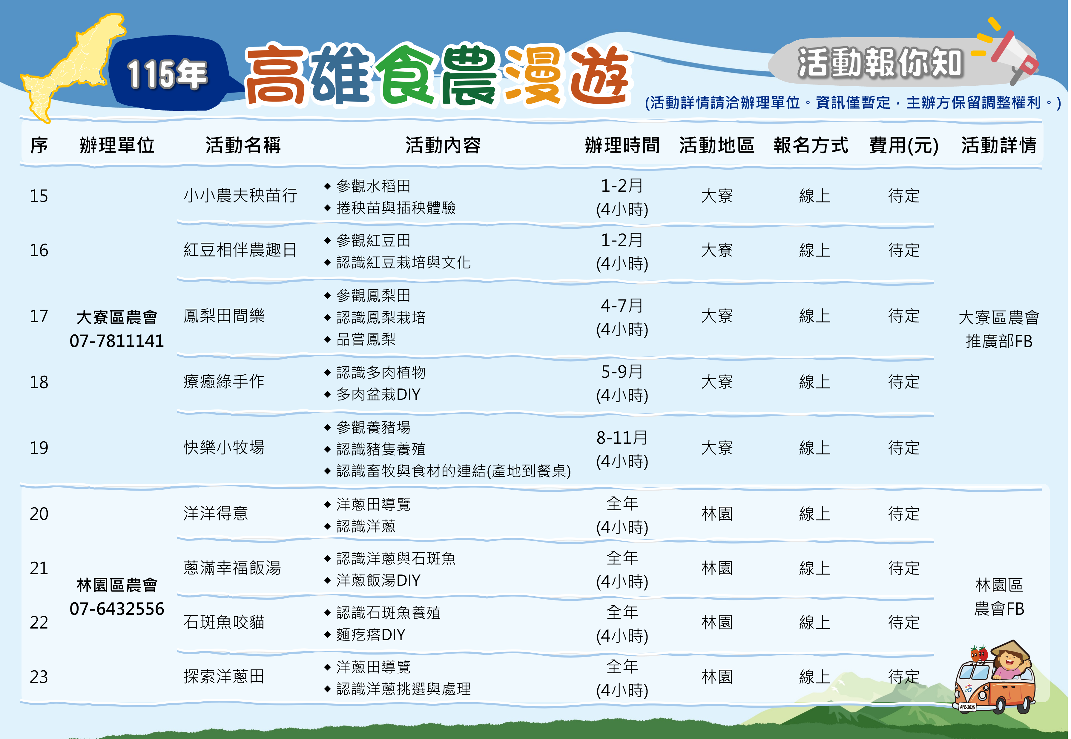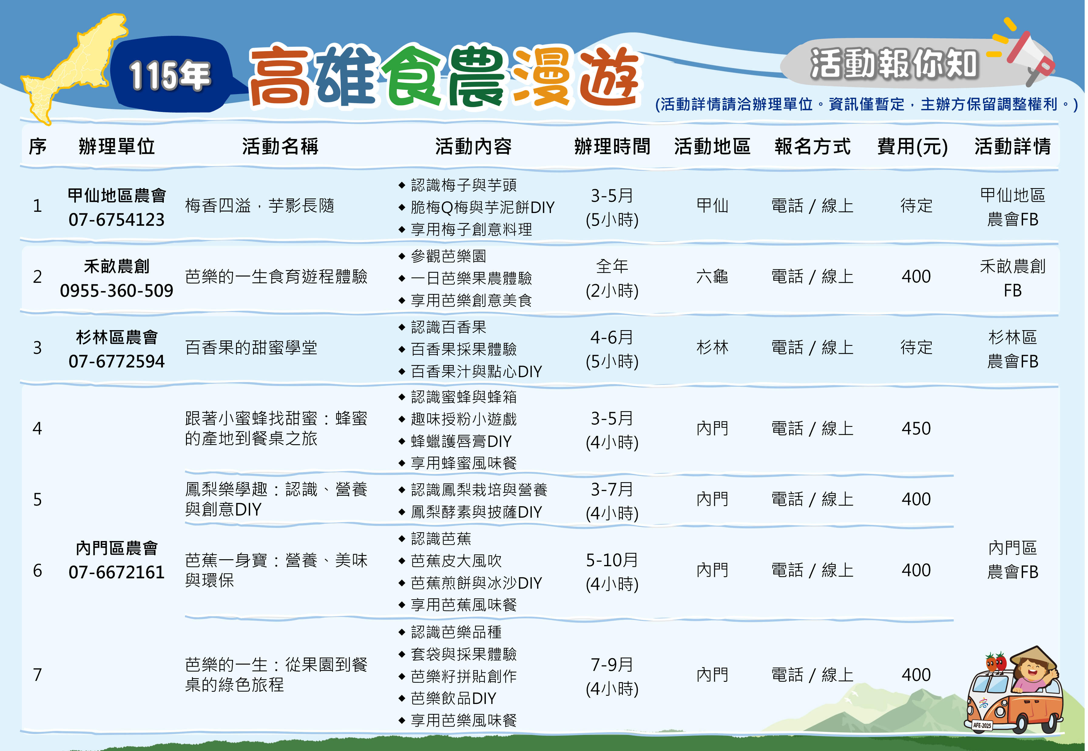 想來點寓教於樂的小旅行嗎? 快來看看明(115)年高雄各地將推出的食農教育體驗活動有哪些吧!一起探索在地農業魅力!