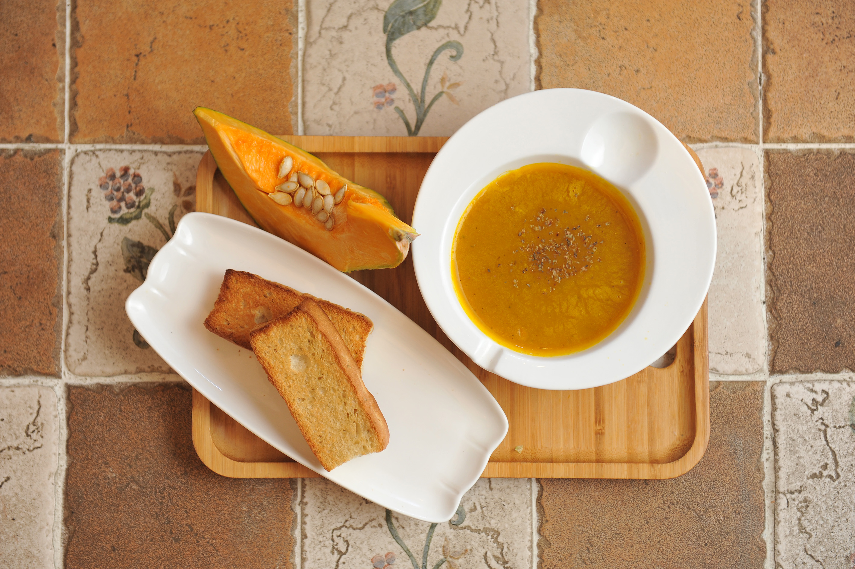 選用六龜小農栽種的粟子南瓜,加上頂級鮮奶油及鮮奶熬煮湯頭,奶香淡雅,南瓜綿密濃稠的口感十分宜人。