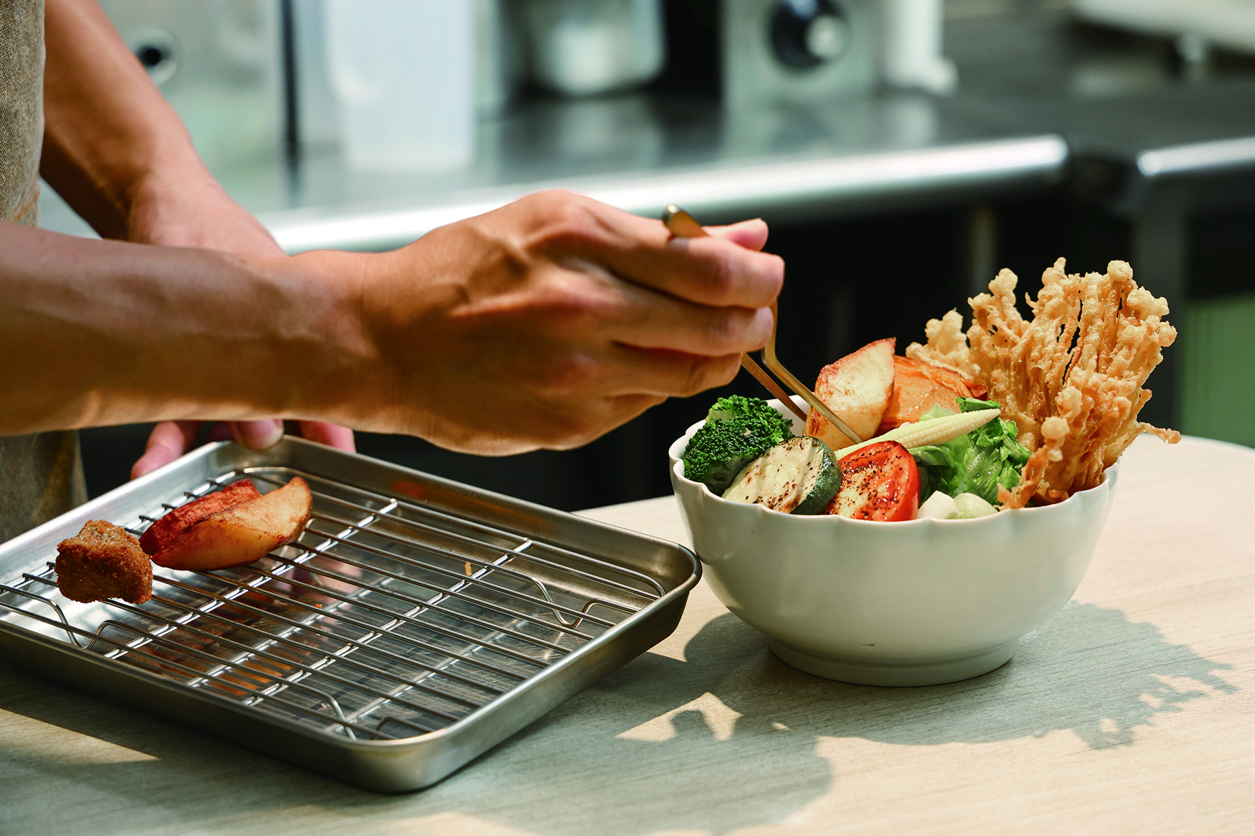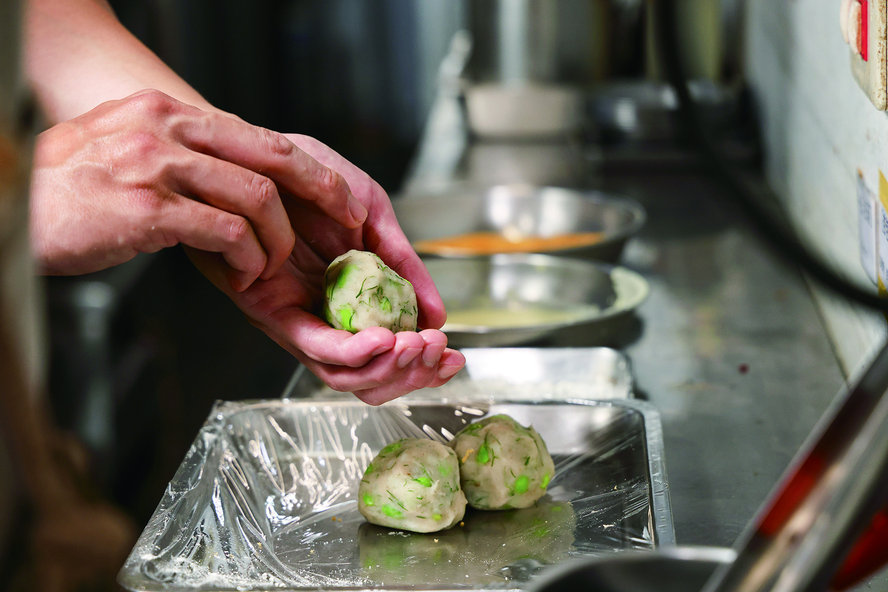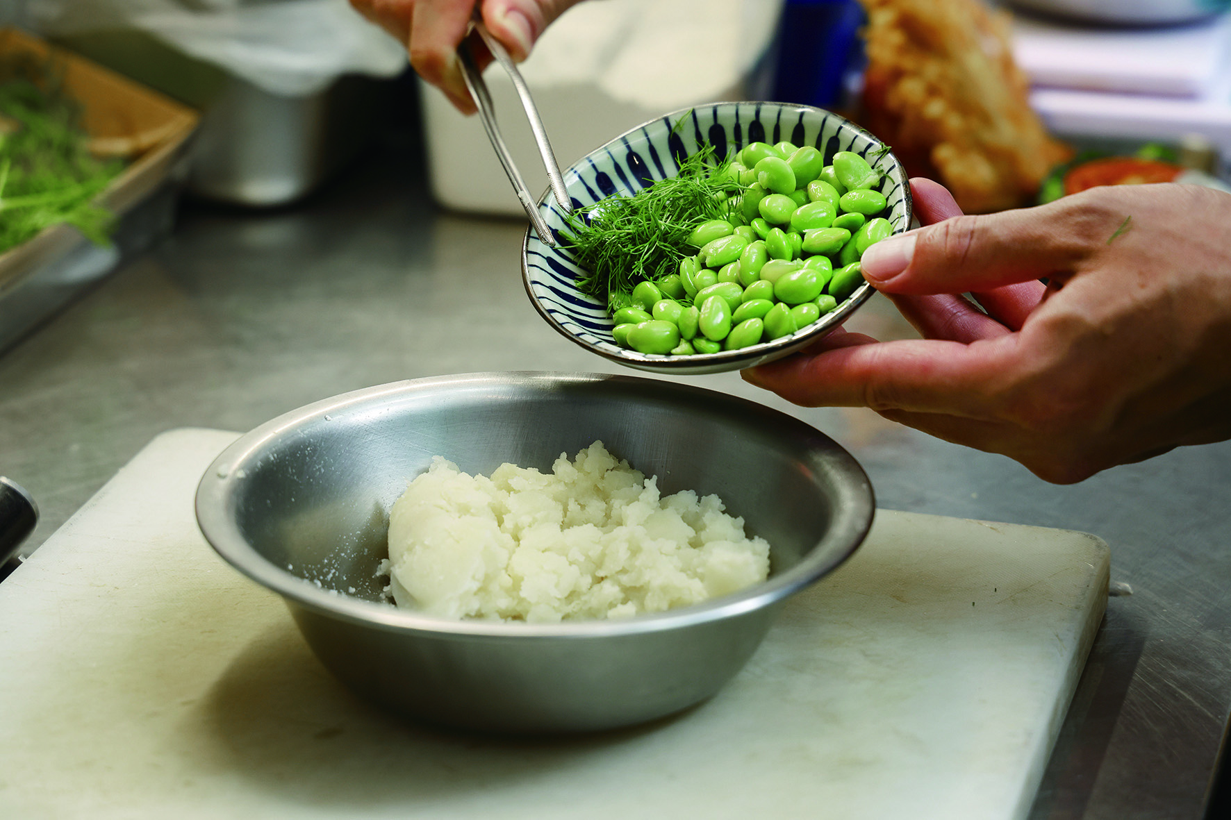 咬下熱呼呼的可樂餅,鬆軟的馬鈴薯之外,高雄11號毛豆「香蜜」散發淡淡芋頭香,沾上豆漿風味美乃滋,炸物也能清爽不膩口。