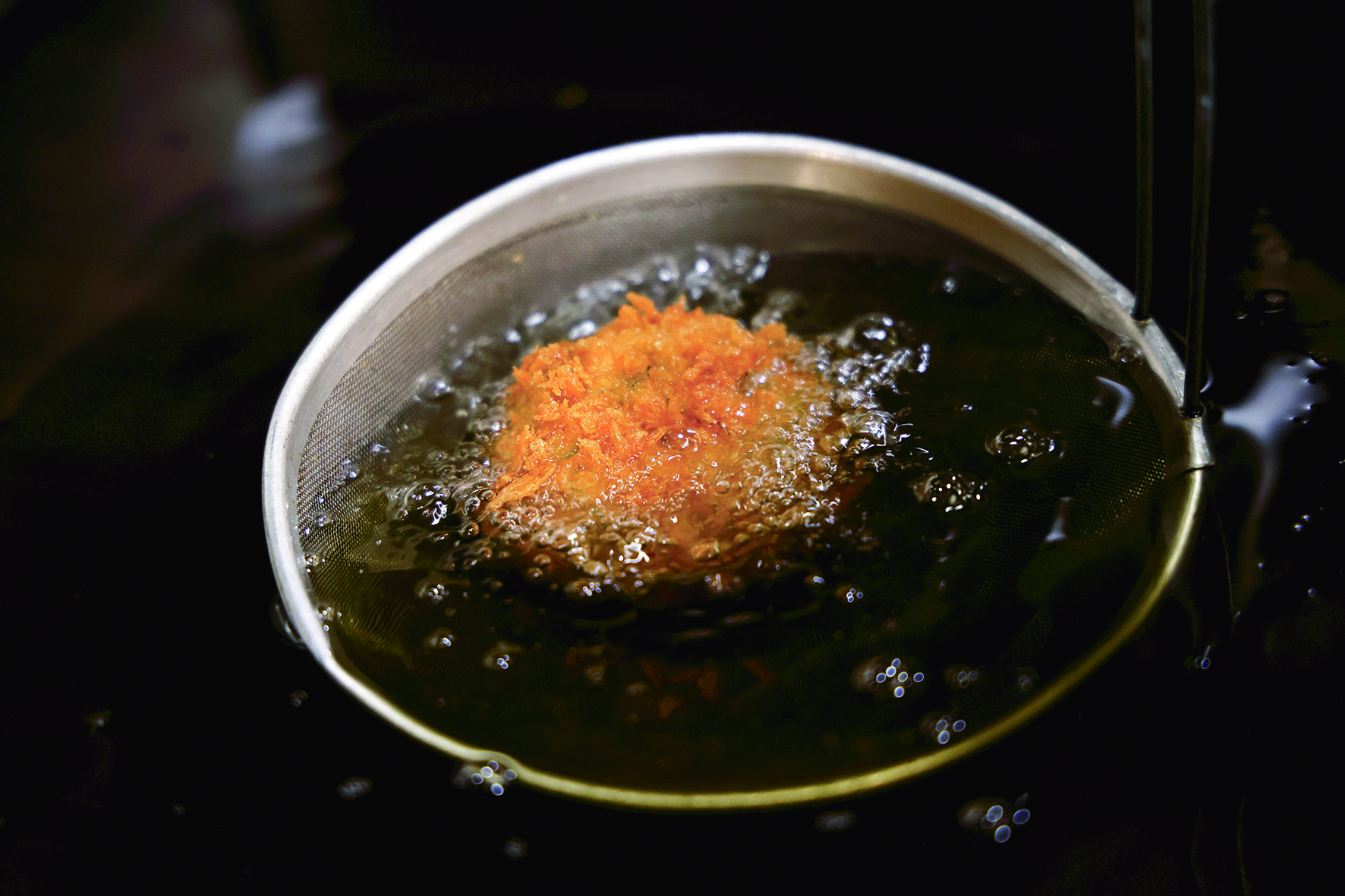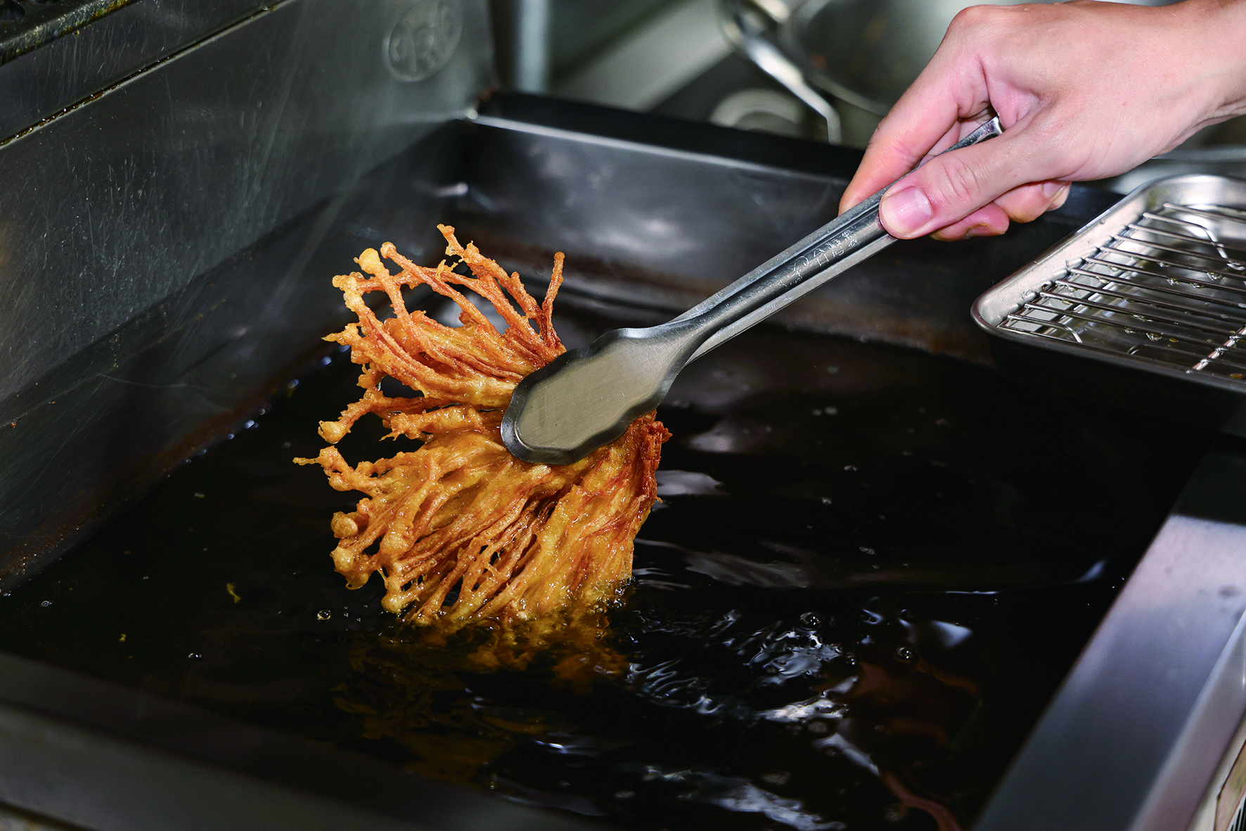 炸物蔬菜裹上酥炸粉漿,入油鍋炸至金黃。