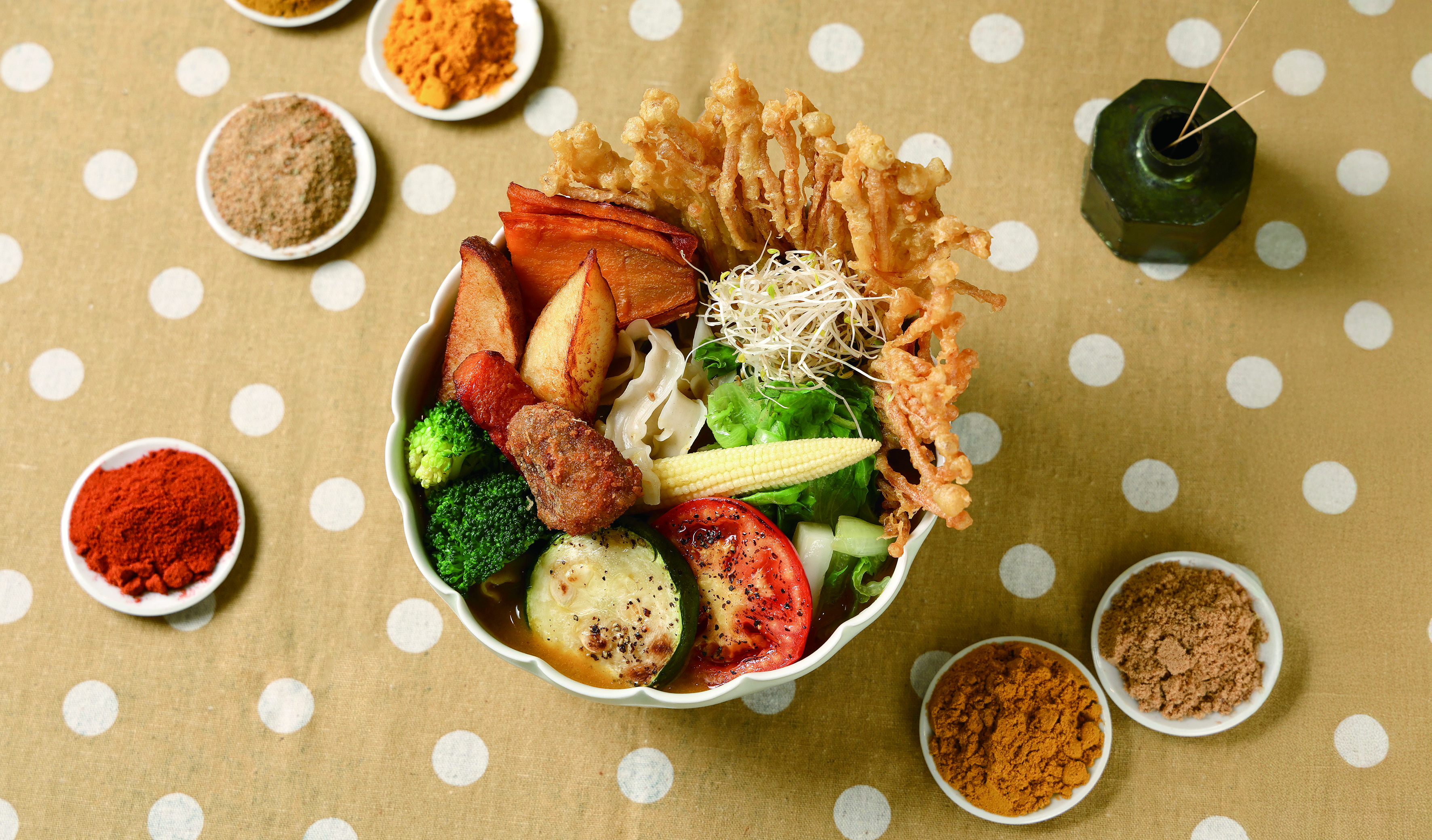 麵條煮熟,淋上咖哩湯底,鋪上炸蔬菜即完成。