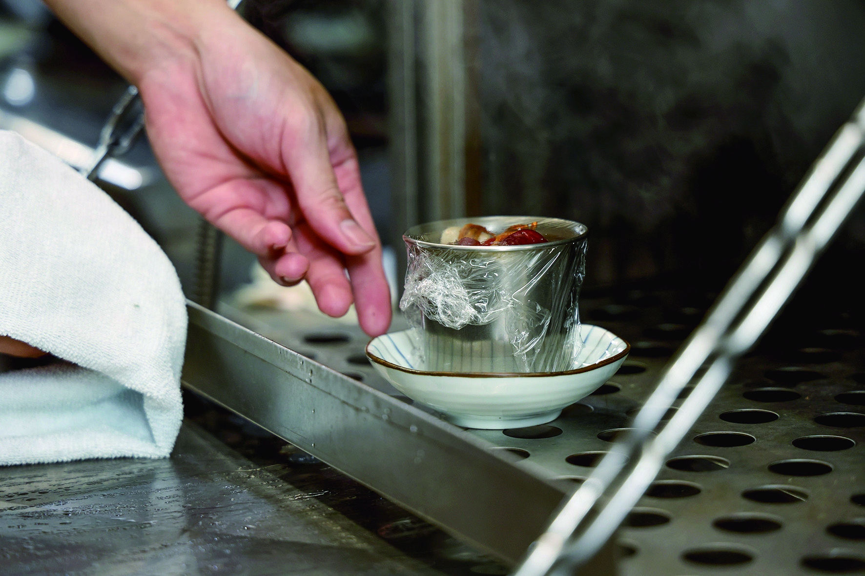 炒料與枸杞、薑片、鮮蘿蔔、蘿蔔乾放入燉盅,加水與白曝蔭油,置入蒸籠或電鍋,以中小火燉約一小時,起鍋前加鹽調整鹹度,即可享用。