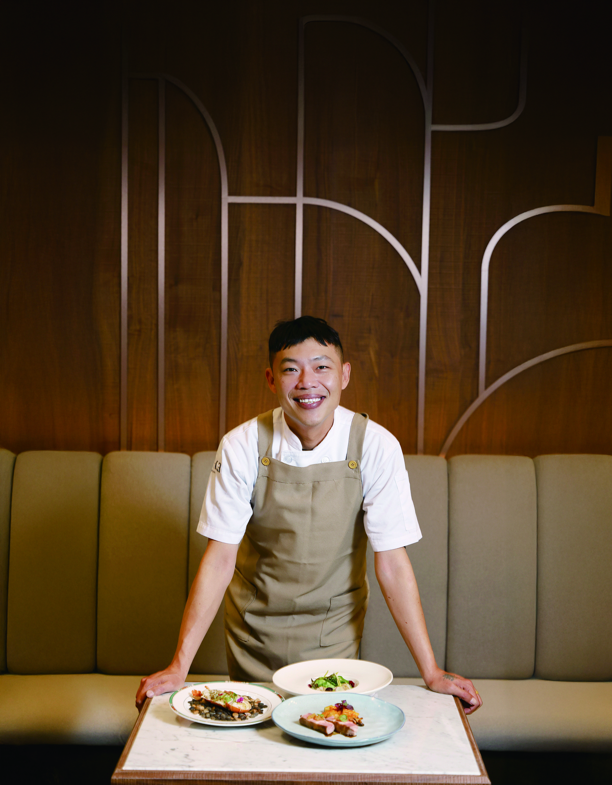 經典鴨胸料理在他的詮釋下,改以日式鰹魚料理常見的「藁燒」(稻草燒炙)手法來處理,結合西式醬汁,轉化為清爽的沙拉上菜。而日式經典天婦羅的炸蝦,則是運用日式彩色米菓為炸衣,搭配西式乳化醬汁與炸櫛瓜花,翻轉炸物的滋味。歐洲生食料理的「韃靼」( Tartare),使用鮪魚刺身搭配醬油醃漬的鵪鶉蛋黃,一起盛裝於最中餅殼,乍看如甜點,實則是開胃前菜,巧妙翻轉既定印象。