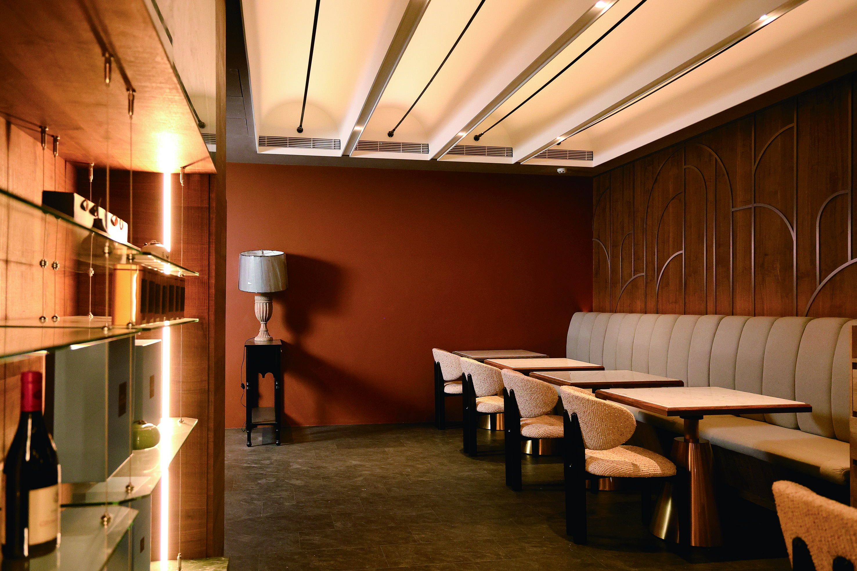 圖說:新餐室的設計以「山海」為主題,天花板與牆板銅線的弧形象徵山巒。