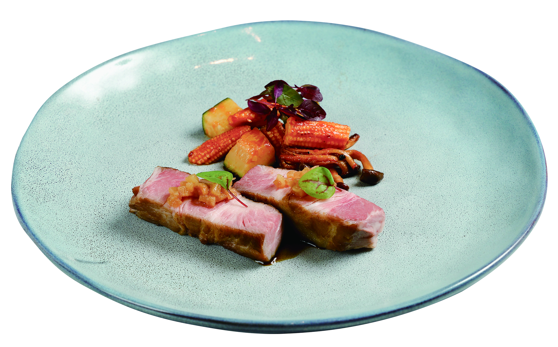 常見於歐陸料理的蘋果肉桂,轉化為偏酸的鳳梨與肉桂搭配,選用大樹鳳梨熬製成「鳳梨肉桂醬」,相佐先舒肥再香煎的迷迭香梅花豬以及番茄燉時蔬,清爽果香可以解膩,也更提升風味層次。