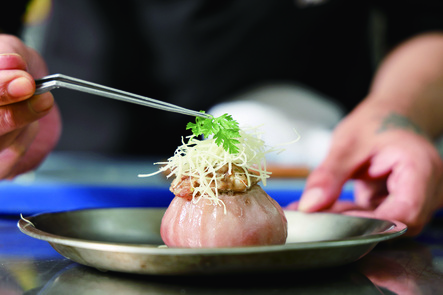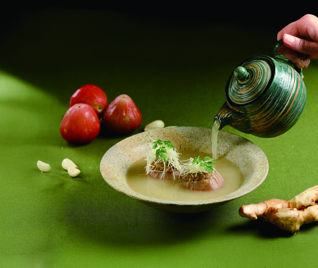 從臺式料理「苦瓜封」得自靈感,選用熟成的高雄蓮霧作為盛器,鑲入肉餡一起蒸煮,果香清雅平衡肉香,佐濃厚雞白湯,是一套中西合璧的創意滋味。