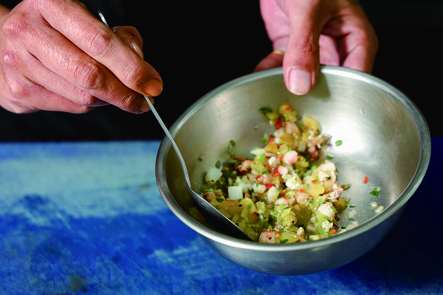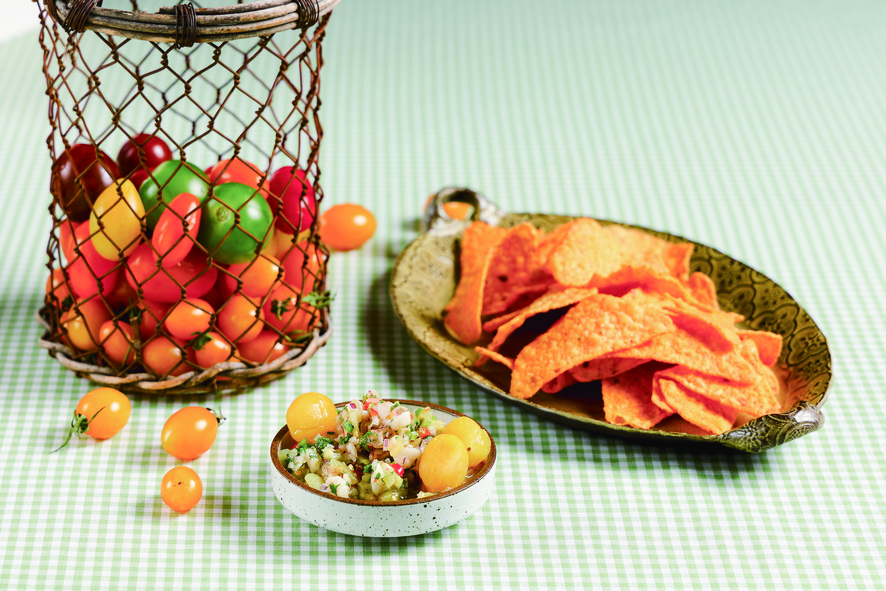 國外下酒開胃菜常使用的莎莎醬,主體番茄改用美濃、六龜盛產的橙蜜香小番茄,其果肉的甜度高,配方可以減少糖量,使解饞零嘴吃起來更健康。