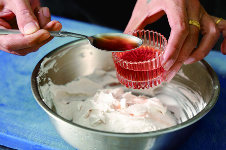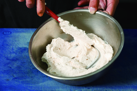 步驟1的材料加入馬斯卡彭乳酪拌勻,依序加入草莓果醬、草莓白蘭地。