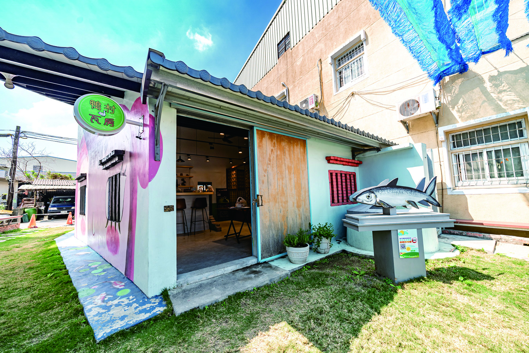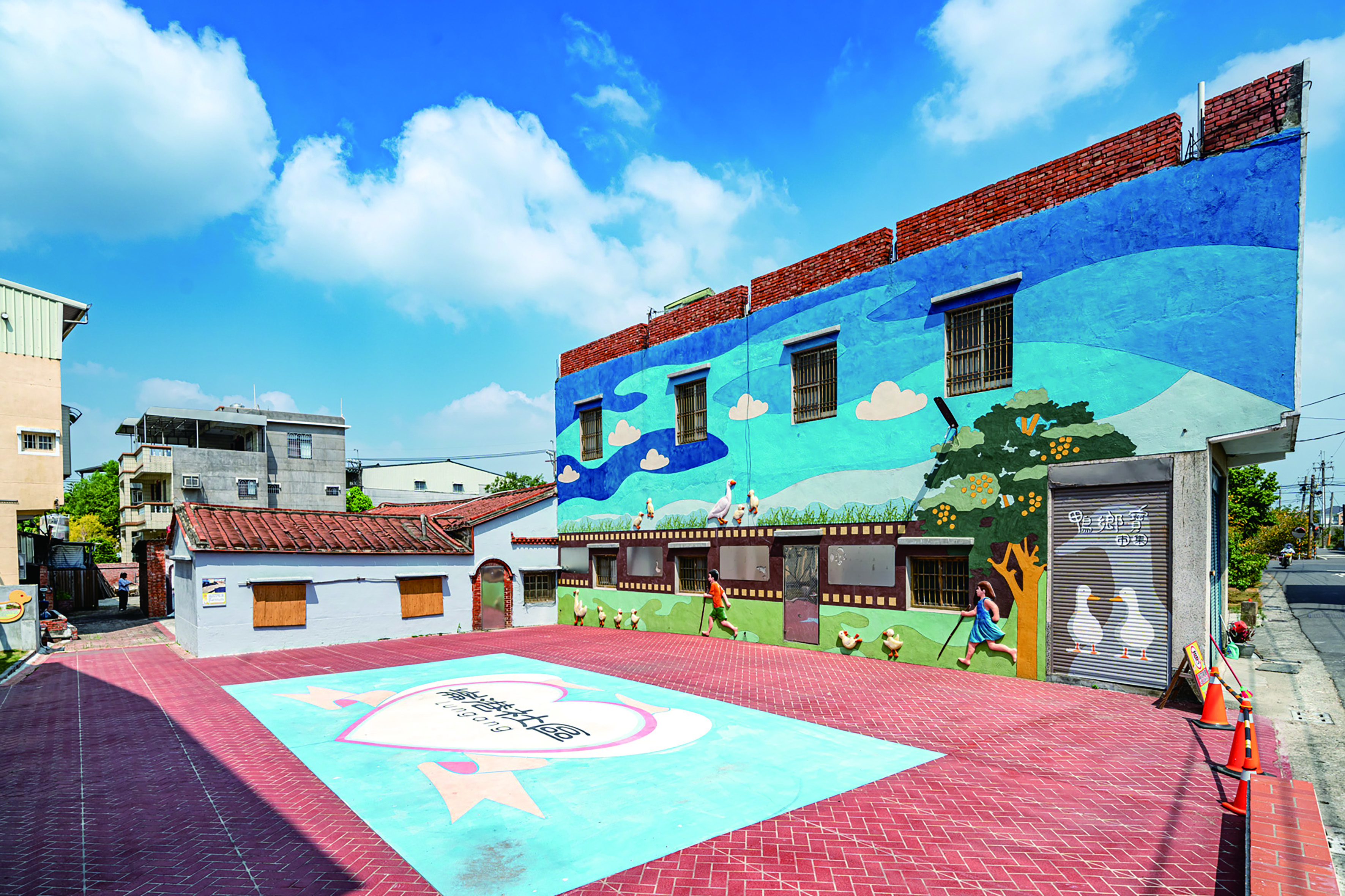 走入崙港社區,最吸睛的「鴨村瓦房直賣所」原本是一處屋頂坍塌、只剩半邊牆的廢墟。為解決長年存在的荒廢問題,里長與地主溝通後,將空間交由社區託管,重新整理,並與設計系學生合作彩繪,使其蛻變為導覽與物產販售的重要據點。屋外廣場則於每年農閒時節舉辦「啵啵鴨市集」,成為凝聚社區的新型節慶活動。