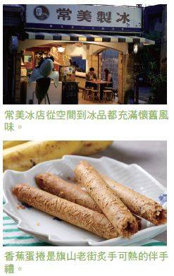 旗山無處不香蕉, 走在老街上尤能感受處處「蕉」香。由於香蕉不耐貯存,腦筋動得快的商家把熟蕉加工成各式各樣的美食。像是旗山第一間西式麵包店「吉美」,將香蕉加入麵糰烘焙作成香蕉蛋糕;另一家老店「枝仔冰城」做成香蕉蛋捲、香蕉脆皮雪糕,吸睛的料理創意讓兩家老店再度翻身成為人氣店。走到遠一點的老字號「常美冰店」,則有最傳統的香蕉冰。沸水加入砂糖攪拌,冷卻後加入香蕉油冰凍成塊,再剉成雪花般的碎冰,以此為基底,加上紅豆或香蕉、鳳梨等水果,微甜清新的風味紅透半個多世紀。其他店家輸人不輸陣,紛紛把香蕉化身紅豆餅、雞蛋糕、酥皮濃湯、冰蜜茶⋯⋯ 香蕉究竟有多少令人驚艷的風貌?來了旗山就知道!