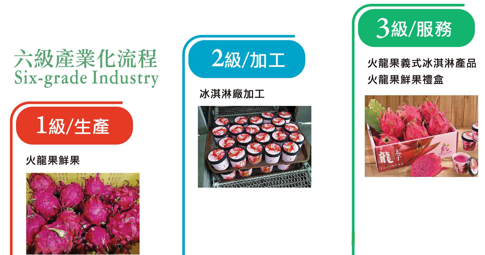 幾年前,為了糖尿病所苦的父親劃出一半農園面積,以網室無農藥栽培改種大紅品種的火龍果,命名「龍太子」。幾年前他到農試所上課,發現了既健康又時尚的鮮果加工品—義式冰淇淋,而火龍果色澤鮮麗、汁液豐甜、極具賣相,正是製作義式冰淇淋的絕佳食材,決定往二級產業邁進。